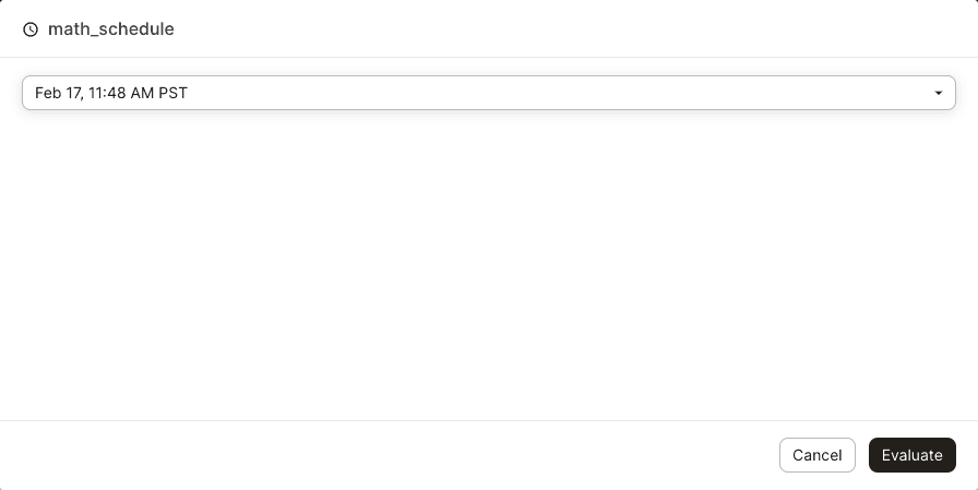 4. You'll be prompted to select a mock schedule evaluation time. As schedules are defined on a cadence, the evaluation times provided in the dropdown are past and future times along that cadence.